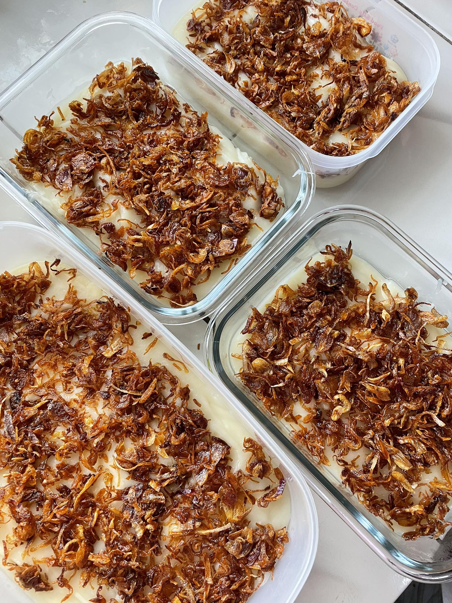 The final touch is what surprises first-timers. Thinly sliced shallots are fried until golden and fragrant, often in ghee in the East Coast version. Some makers toss the fried shallots lightly with sugar before scattering them over the kuih. This small detail matters. The sweetness of the kuih meets the savoury aroma of shallots, creating a balance that feels deliberate rather than odd. It is this contrast that defines Kuih Qasidah’s character.