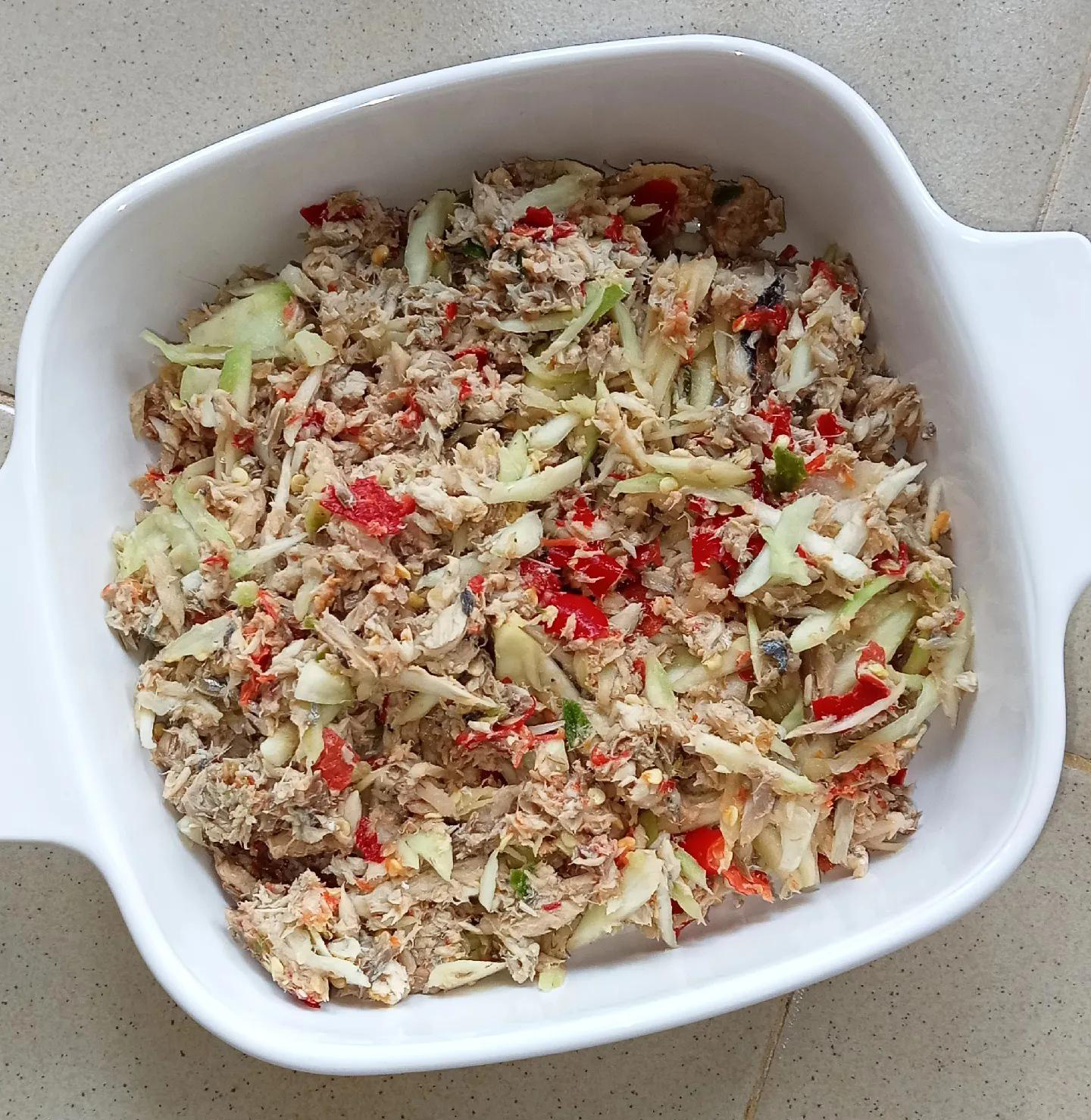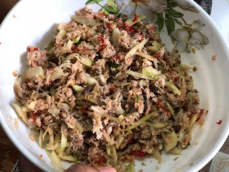 The preparation is simple, but very intentional. The young mango is peeled and chopped finely, giving off a sharp, fresh sour aroma. Fish, usually ikan selayang (scad) or ikan kembung (Indian mackerel), is either grilled slowly over fire or fried until cooked. The flesh is then separated carefully from the bones. Chillies, typically bird’s eye chillies (cili padi), are pounded using a traditional mortar and pestle (lesung batu). Some cooks pound the fish together with the chillies, while others mix them separately. Everything is then combined and lightly seasoned with salt, and sometimes a bit of sugar to balance the flavours. The sambal is not cooked after mixing, it is eaten fresh, resulting in a bold combination of sour, spicy, and savoury richness.